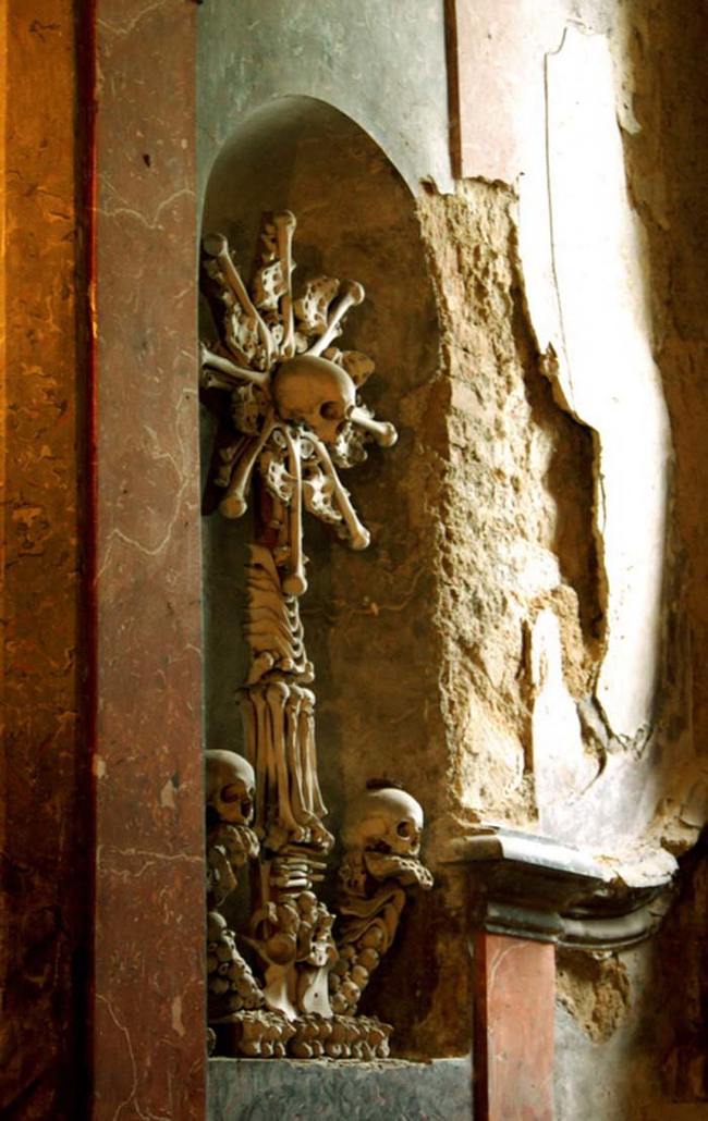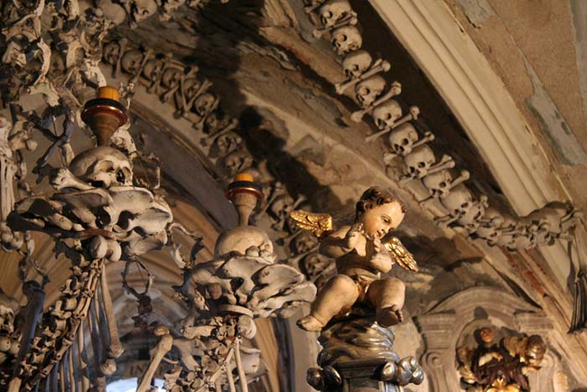 تقع إحدي الكنائس الأثرية في جمهورية التشيك والتي تحتوي علي تجمع كبير وهائل جداً للموتيالذين ماتوا بسبب الطاعون الذي كان منتشراً في وقتها، لذلك طُلب من أحد الكهنة تفريغ أماكن للدفن عن طريق جمع عظام الموتي ولكنه عجز عن ذلك إلي أن أحيلت المهمة إلي نجار والذي نظر إلي الأمر بزاوية مختلفة وهي زاوية الفن حيث قام بتجميع هذه العظام مع بعضها البعض وقام بعمل منحوتات فنية غريبة جداً تصيب من يدخل هذا المكان بالرعب من هول ما يري من العظام الجماجم المتناثرة في كل مكان. نترككم مع الصور الغريبة لهذه المنحوتات ونرجو ألا يصيبكم الفزع منها. برجاء ترك تعليقاتكم علي الموضوع في صندوق التعليقات بالأسفل.
