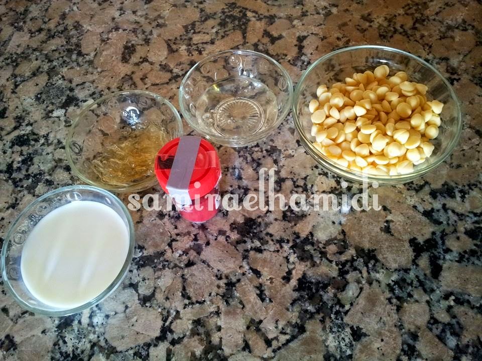 نضع الشكلاط في حمام مريم فقط ليسخن وليسهل اذابتها عند اضافة الحليب اليها (لانه من المعروف شكلاتة البيضاء الجيدة تاخد وقت طويل فالذوبان لهذا ولو اردنا ان نديبها لوحدها ستاخد وقت طويل )