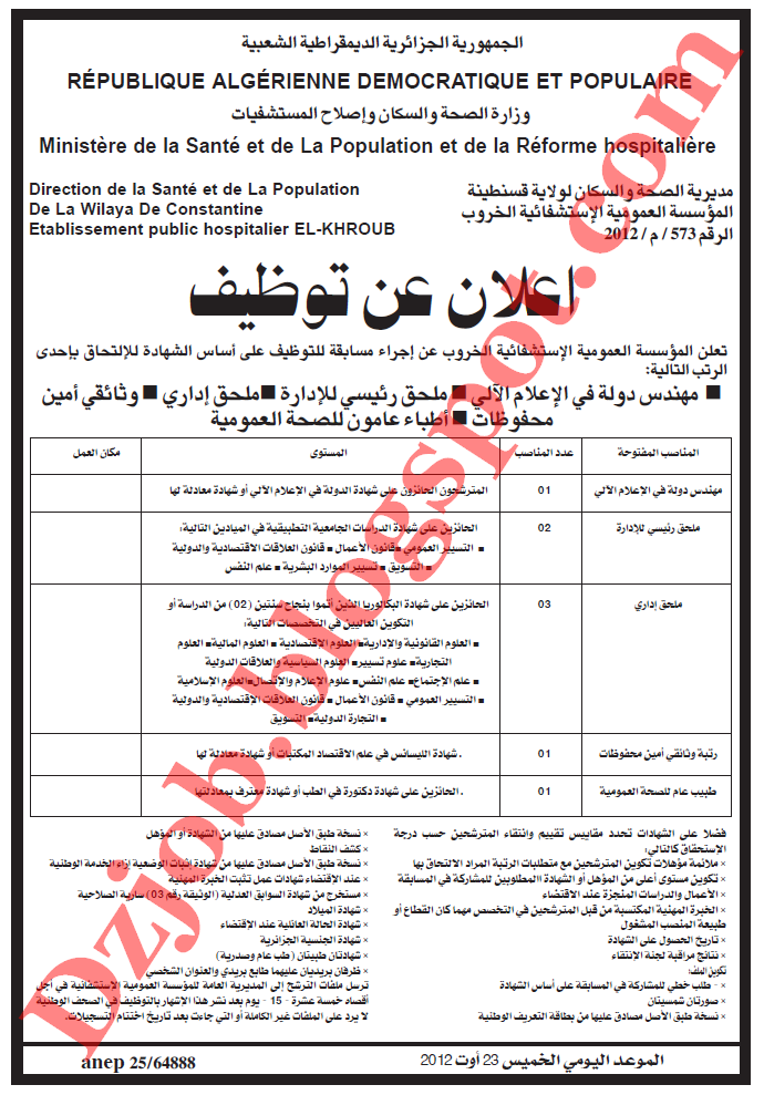 مسابقة توظيف في المؤسسة العمومية الإستشفائية الخروب بولاية قسنطينة أوت 2012