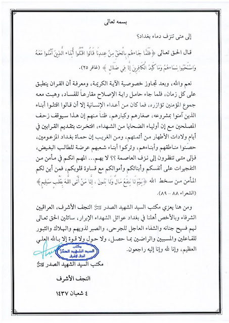 ومن هنا يعزي مكتب السيد الشهيد الصدر النجف الأشرف، العراقيين الشرفاء وبالأخص أهلنا في بغداد عوائل الشهداء الإبرار، سائلين الحق تعالى لهم فسيح جنانه والشفاء العاجل للجرحى، والصبر لذويهم والهلاك والثبور للفاعلين والمسببين والراضين بما حصل، ولا حول ولا قوة إلا بالله العلي العظيم، وإنا لله وإنا إليه راجعون