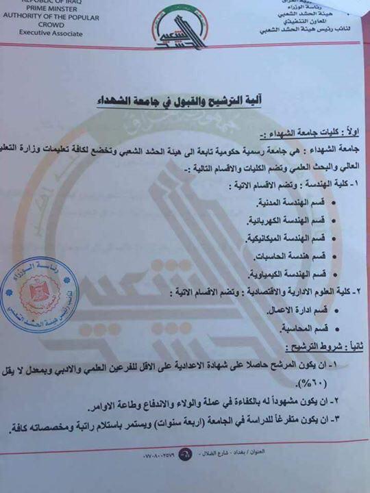وتنشر / بدر نيوز/ آلية الترشيح والقبول في جامعة الشهداء بموجب كتاب هيئة الحشد الشعبي / المعاون التنفيذي لنائب رئيس هيئة الحشد الشعبي بالعدد (436) في 22/11/2016.