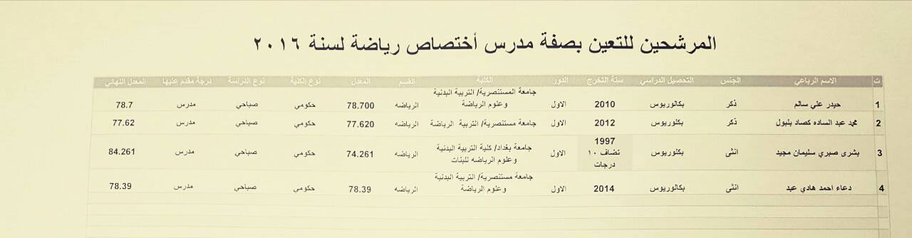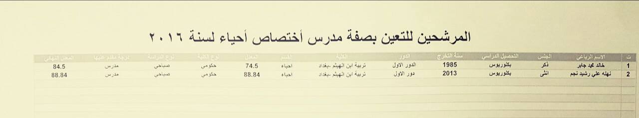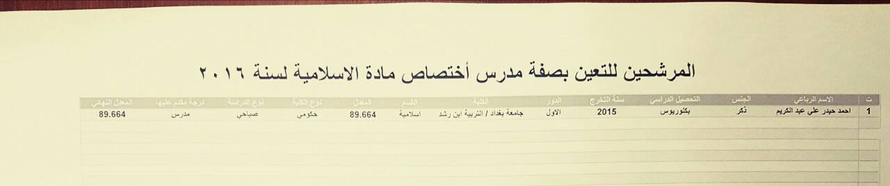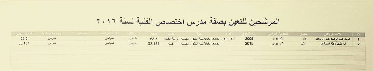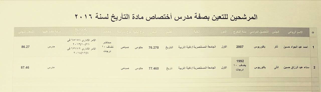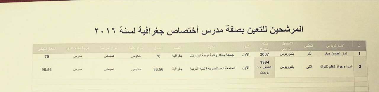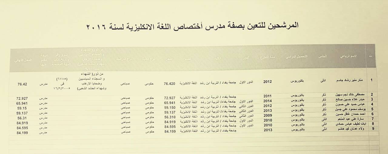 المرشحين للتعيين بصفة مدرس على ملاك المديرية العامة لتربية بغداد الرصافة الأولى 4-12-2016