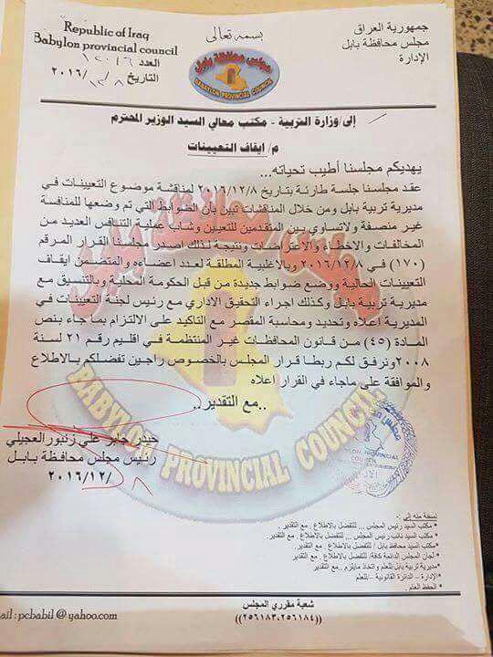 عاجل/ مجلس محافظة بابل يقرر ألغاء تعيينات مديرية تربية بابل يعني كل اسماء الي ظهرت تم ألغاءه بسب مخالفة الضوابط والتحقيق مع رئيس لجنة التعيينات لمحاسبة المقصر .
