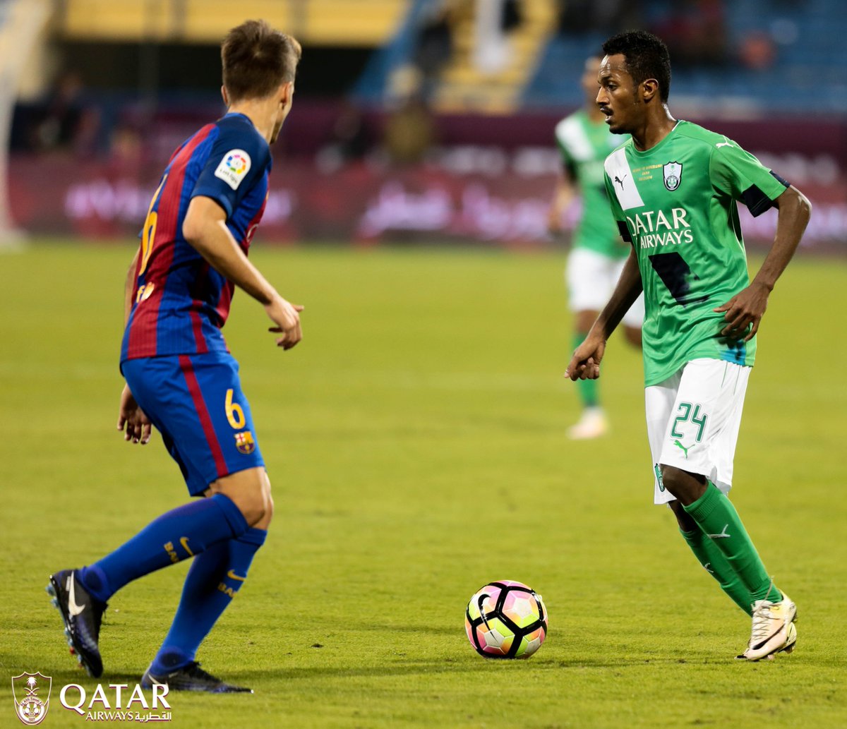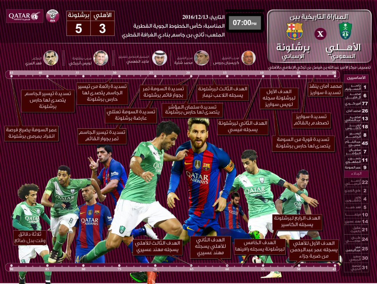 مباراة برشلونة والاهلى السعودي الودية اليوم الثلاثاء 13-12-2016 على إستاد نادى الغرافة القطرى فى مباراة ودية قوية أقيمت تحت رعاية الخطوط الجوية القطرية الراعى الرسمى لكلا من الاهلى والبارسا، الاهلى السعودى وبرشلونة مباراة قوية سعى فيها أهلى جدة الى تحقيق فوز تاريخى للفريق الذى سيخوض المباراة اليوم بالقميص الجديد للفريق فى الموسم المقبل 2017، نتيجة مباراة برشلونة والاهلى السعودى اليوم الثلاثاء فوز فريق برشلونة على الاهلى بخمسة أهداف مقابل ثلاثة فى مباراة قوية أحرز فيها اهداف البارسا ميسى ونيمار وسواريز وألكانتارا والكاسير بينما أحرز أهداف الاهلى عمورى ومهند عسيرى “هدفين”.