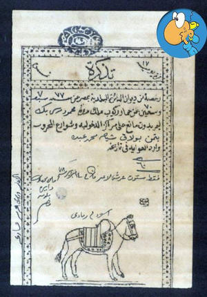 والصورة لرخصة حمار ـ ضمن مقتنيات متحف السكة الحديد ـ خاص بالخواجة "علي بادير" صادرة من ديوان الدائرة البلدية بمصر عام 1878 تتيح له السير في شوارع الـ "محروسة".