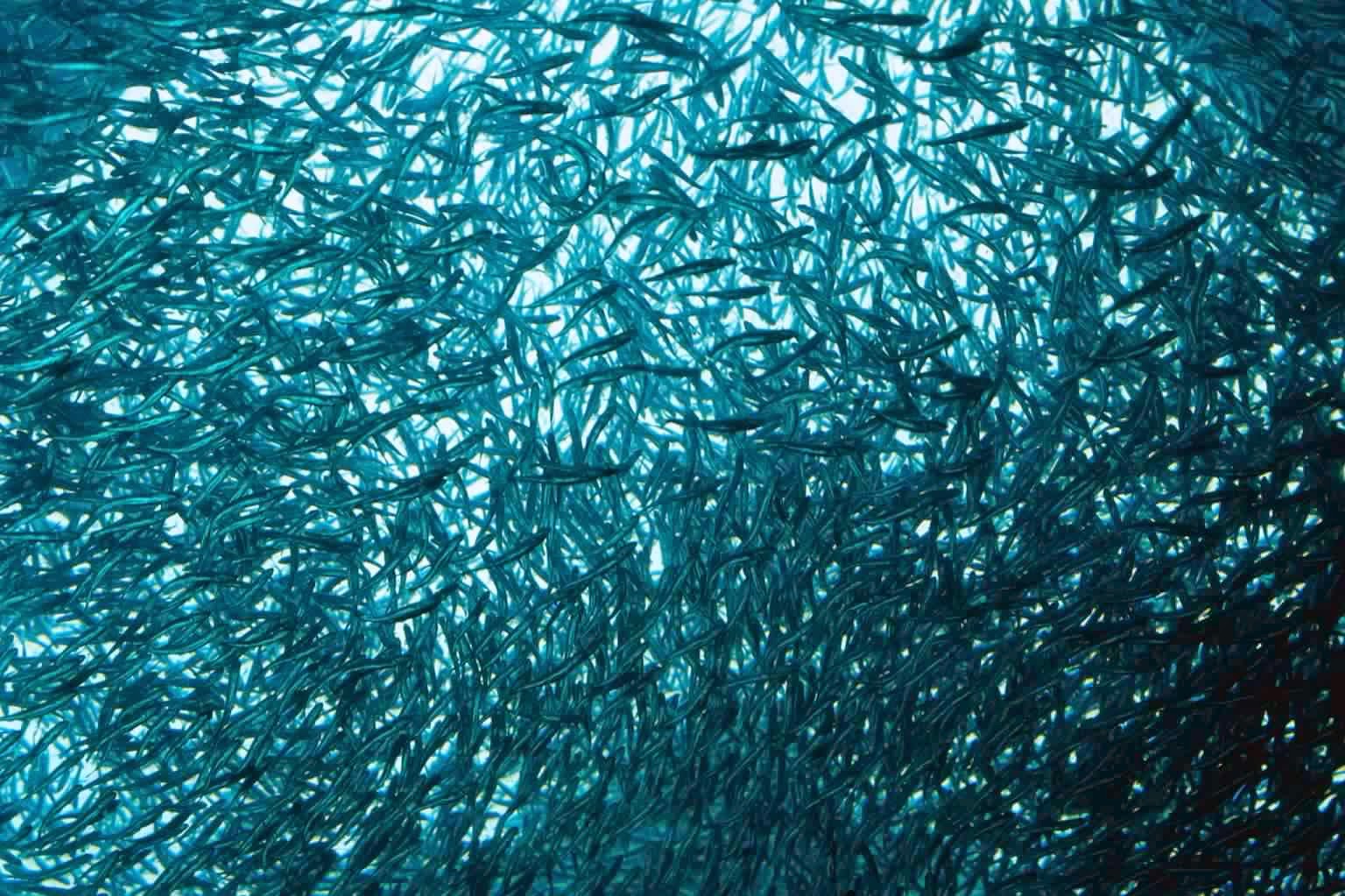دورة حياة سمك السلمون حيث تظهر الصورة مجموعة كبيرة من صغار سمك السلمون ملتحمة فيما بينها لتحفظ نفسها من كل الأعداء.