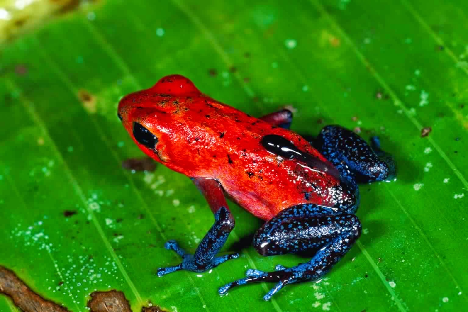 الصورة الثانية تم التقاطها في كوستاريكا، وتظهر ذكر ضفدع الفراولة السام وهو يحمل على ظهره شرغوفه الصغير باحثا عن زهرة مملوءة بالماء لإيداع ذلك الحيوان الصغير.