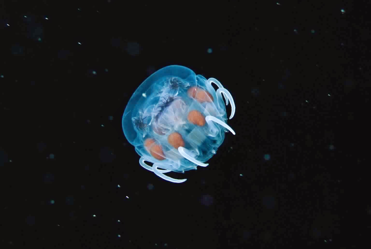 الصورة لصغير قنديل البحر يطفو في المياه المظلمة البولينيزية. قنديل البحر هو من الكائنات البحرية القديمة جدا في كوكبنا بحيث وفقا لمؤسسة سميثسونيان فقد كانت تعيش ربما حوالي 400 مليون سنة قبل عصر الديناصورات.