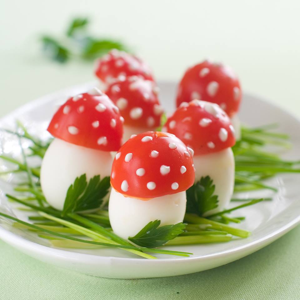 - على طبق، نقطع القليل من البيض في القاعدة كي نتمكن من وضعه على الطبق ونغطيه من الأعلى بنصف الطماطم الصغيرة وتزيين بالمايونيز.