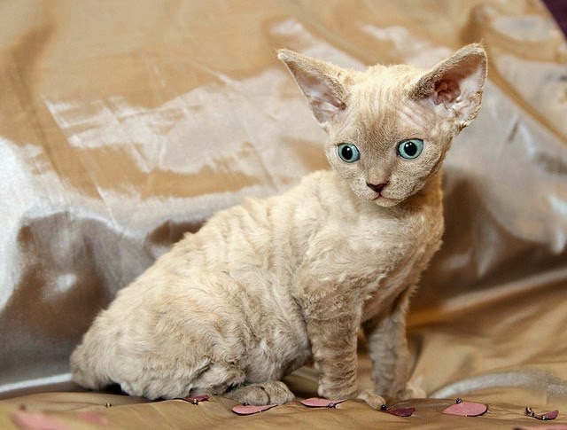 انها قطط ريكس ديفون, تتميز بشعرها القليل جدا و المجعد, كما ان لذيها أذنين طويلتان و عينين كبيرتان.