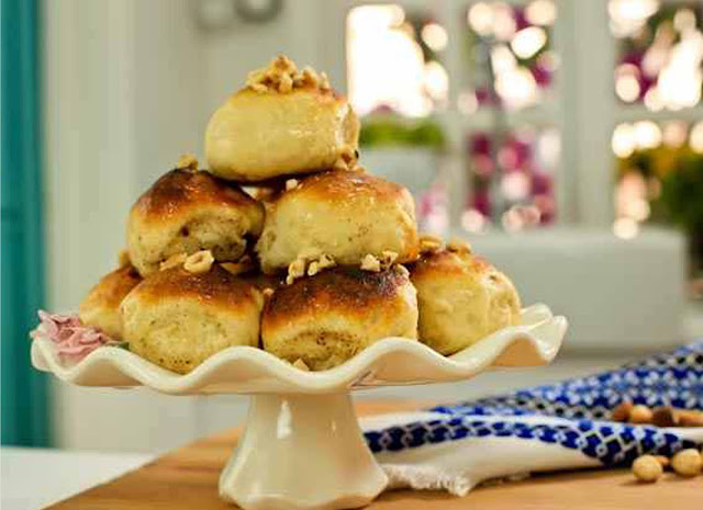 6- تخبز فى فرن متوسط الحرارة لمدة 15 دقيقة إلى أن تأخذ اللون الذهبىِ.7- تسقىَّ خلية النحل بالقطر المُحضر مباشرةً بعد خروجها من الفرن، وتزين بقليل من البندق المجروش.