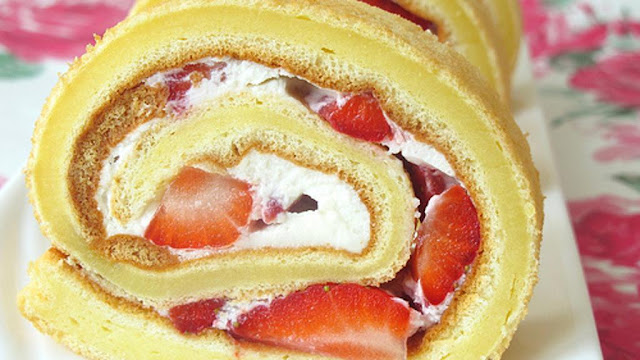 4- اقلبى الكيك على شبكة معدنية ليبرد، ويرفع ورق الزبد. وافردى طبقة من ورق الزبد ثم يفرد الكيك ويوضع الحشو ويلف جيداً في ورق الزبد ثم ورق بلاستك ويترك حوالى 4 دقائق بالثلاجة حتى يتماسك، قطعيه إلى حلقات بالسكين ويقدم مع الكريمة المخفوقة والفواكه.