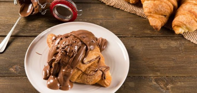 8- ادهني القاعدة بشوكولاتة النوتيلا ولفي المثلث للحصول على شكل كرواسون وضعيها في الصينية.