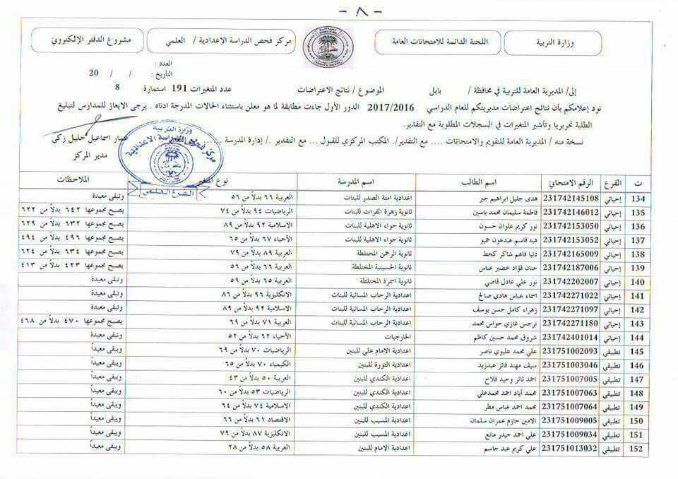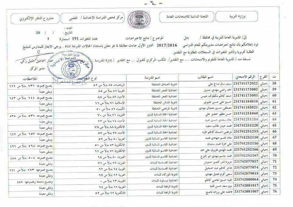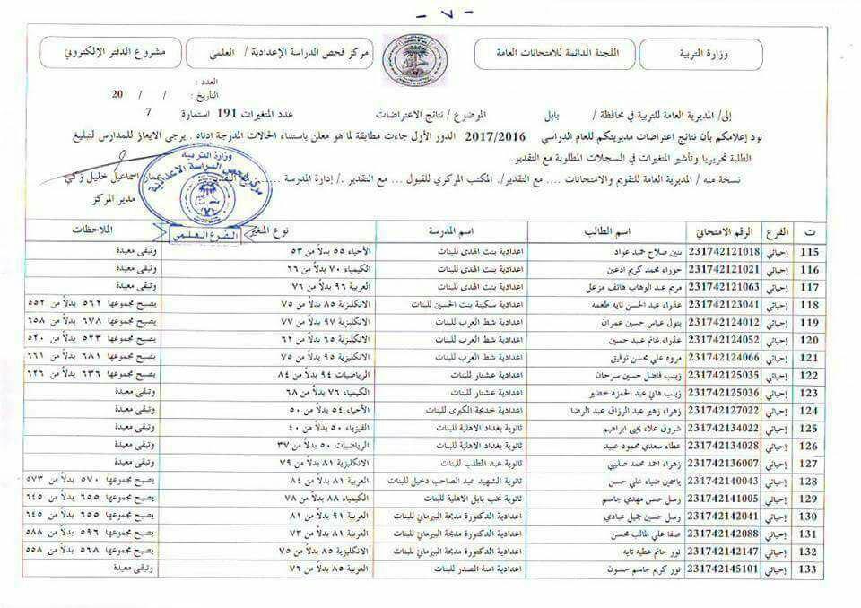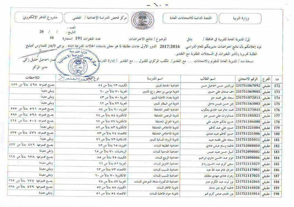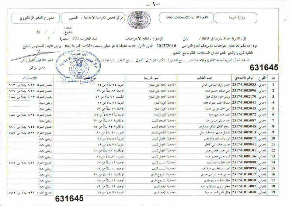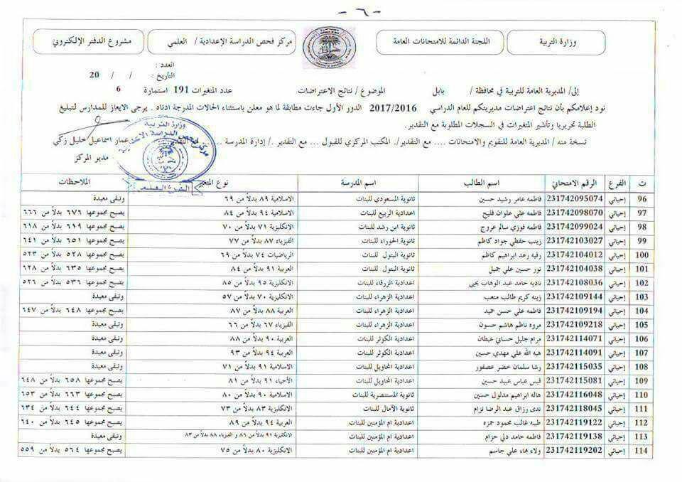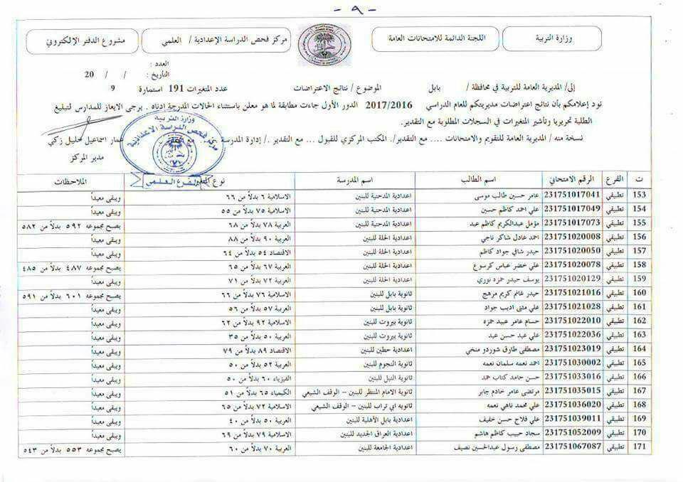 نتائج أعتراضات السادس الأعدادي لمحافظة بابل - الدور الأول 2017/2016 (الفرع العلمي )
