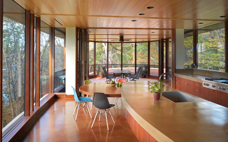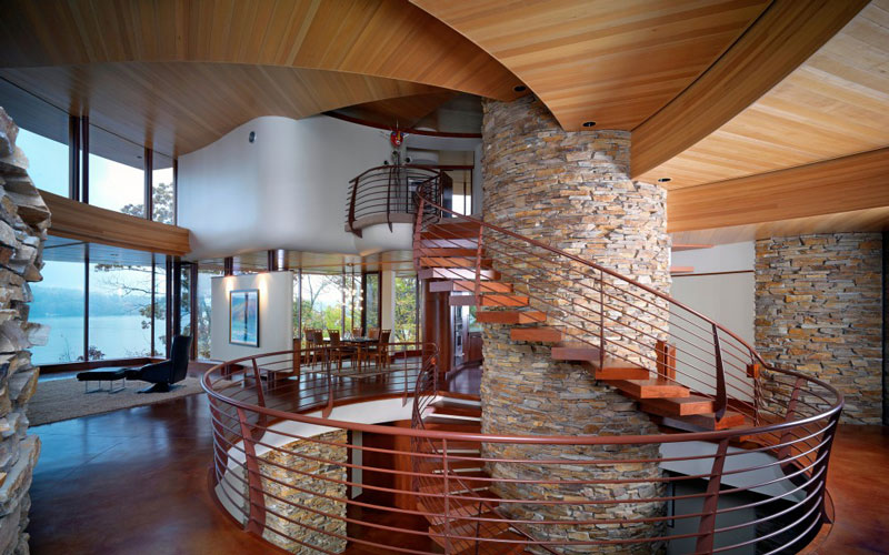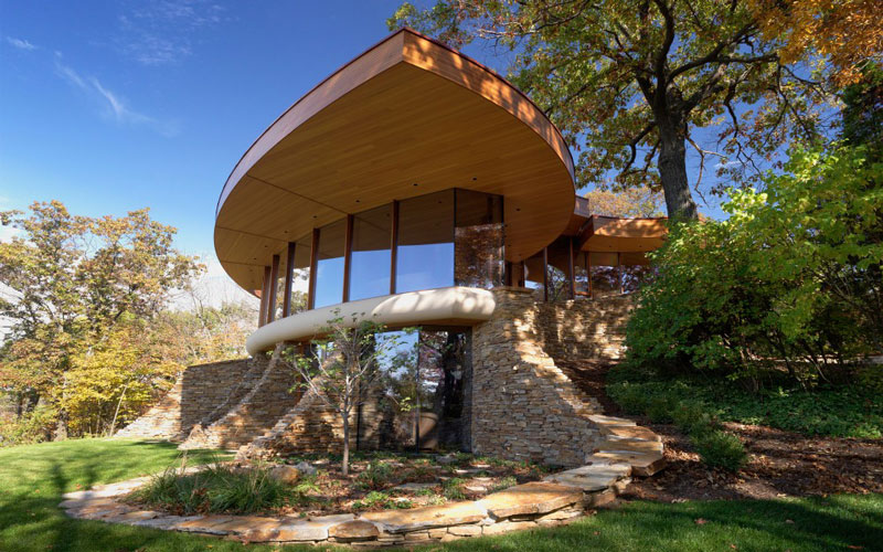 Located adjacent to a lake in Chenequa, Wisconsin (west of Milwaukee), this curvaceous residence was beautifully built by architect Robert Harvey Oshatz. Designed in 2009 and completed in 2011, the Chenequa Residence wraps around the face of a hill and pivots around established trees.Featuring expansive windows with incredible views of the surrounding environment; stone, wood and concrete are seamlessly integrated into this stunning residence. The internal spaces extend out from a central atrium which is anchored by a circular stone core that almost looks like a tree trunk from afar.Oshatz established his own firm in 1971 and is well known for his unique and organic style. His buildings are bold and memorable and his design approach is fascinating: