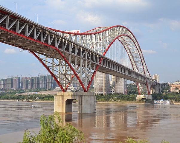 جسر كاوتيانمن (2009) فوق نهر يانغتسي في مدينة تشونغتشينغ في الصين، يحتوي على قوس حديدي مشبك يبلغ طوله 552 متر.