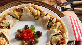 4 تُقطع البيتزا إلى شرائح وتُقدم ساخنة.