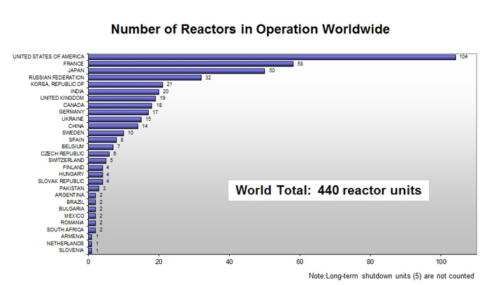 يلاحظ في الشكل الآتي أن الولايات المتحدة الأمريكية وفرنسا واليابان تتصدر قائمة المفاعلات النووية القائمة اليوم في العالم، تليها كوريا وبريطانيا وكندا وألمانيا والهند وأوكرانيا والصين والسويد. أما الدول التي يتراوح عدد مفاعلاتها النووية بين 4 – 8 مفاعلات فهي إسبانيا وبلجيكا والتشيك وسلوفاكيا وسويسرا وفنلندا وهنغاريا. أما باقي الدول في الشكل فتمتلك مفاعلاً أو اثنين في أحسن الأحوال. إن المفاعلات النووية المنتشرة اليوم في العالم والتي وصل عددها إلى 440 مفاعل عامل ، تنتج 2525 تريليون واط ساعة من الطاقة الكهربائية سنوياً وتستهلك حوالى 66658 طن من اليورانيوم الطبيعي، الأمر الذي سوف يؤدي إلى نضوب الاحتياطي العالمي من اليورانيوم خلال 53 سنة، على افتراض أن كميات اليورانيوم القابلة للتعدين بربحية معقولة تقترب من أربعة ملايين طناً. وهذه الفترة تتزامن مع تاريخ نضوب النفط على صعيد عالمي. وربما سيكون نضوب اليورانيوم أسرع إذا اتجهت المفاعلات النووية لإنتاج غاز الهيدروجين لتزويد مركبات المستقبل بهذا الغاز الذي يتولد عن احتراقه ماء صافي(4)، أو ربما لتحلية المياه لغايات سد حاجة بعض الدول الماسة لمياه الشرب. إذ سوف يتسارع نضوب المادة الخام بوتيرة أعلى إذا تم استخدام الكهرباء لتحلية مياه البحر، وبخاصة في ضوء التغيرات المناخية التي تواجه الكرة الأرضية اليوم وارتفاع درجة الحرارة وشح مياه الشرب وزيادة عدد السكان وما إلى ذلك.