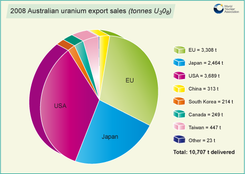 ويصل الإنتاج الأسترالي من اليورانيوم إلى الاتحاد الأوروبي واليابان والولايات المتحدة الأمريكية بكميات كبيرة، كما يتضح من الشكل السابق؛ فإلى أي مدى يمكننا اعتبار إنتاج الطاقة من المفاعلات النووية طاقة نظيفة طالما أن نوعية الخامات في أستراليا رديئة في مجملها؟