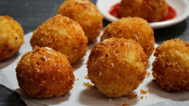 5- حمي زيت غزير في مقلاة على النار، انزلي كرات البطاطس ثم اتركيها حتى تنضج وتتحمر.