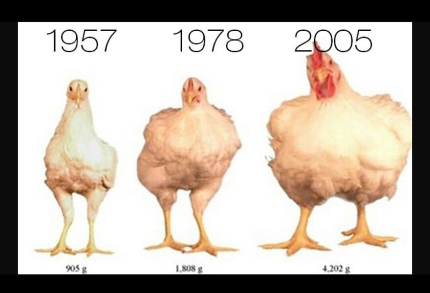 الفرق بين الدجاج قبل 40 سنة واليوم هو ان دجاج هذه الأيام يتكوّن من 266% زيادة في الدهون و 33% بروتين اقل.