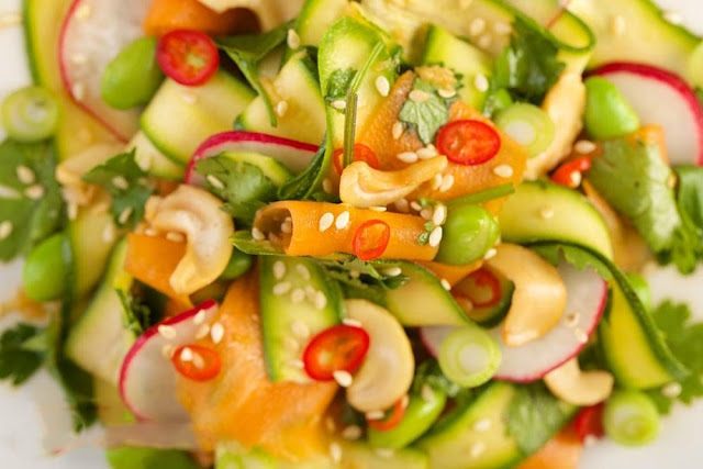 في وعاء زجاجي كبير ضعي محتويات السلطة (الفول الأخضر والفجل الأحمر واللوبيا والبصل والفلفل والبقدونس).