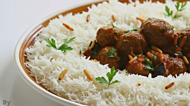 23- إصنعي فجوة في وسط الأرز ثمّ ضعي فيها كرات اللحم والصلصة مع الباذنجان.