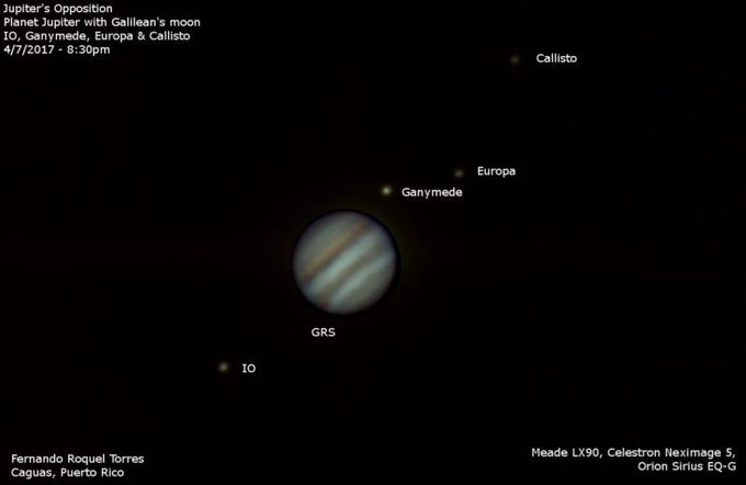وهذا الترتيب المداري يعني أن المشتري يظهر كأكبر قرص في السماء، وسوف يكون مرئيا من غروب الشمس حتى شروقها.