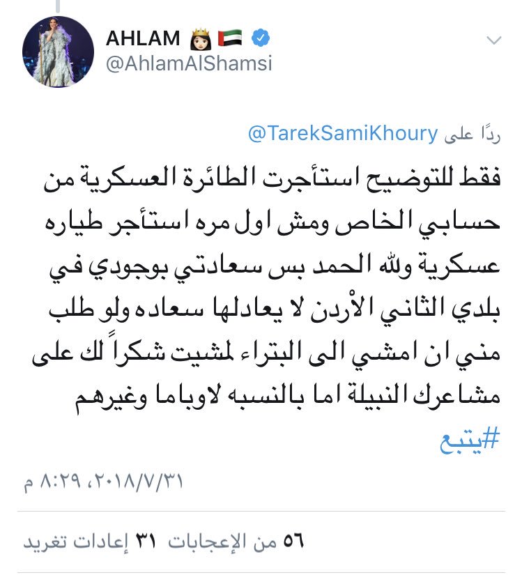 أصدرت القوات المسلحة الأردنية بيانا، لتوضيح مسألة نقل طائرة عسكرية أردنية للفنانة الإماراتية أحلام الشامسي.