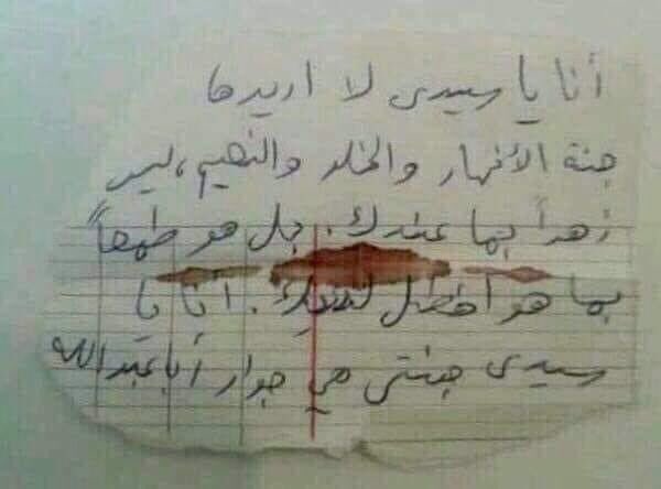 ( أنا يا سيدي لا أريدها جنة الأنهار والخلد والنعيم ، ليس زهداً بما عندك بل هو طمعاً بما هو أفضل لديك . أنا يا سيدي جنتي هي جوار أبا عبدالله) هذه الورقة وجدت في جيب أحد شهداء الحشد الشعبي معفرة بدمه الزكي الطاهر..