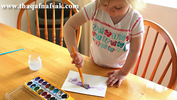 لاتملئ الألوان بالماءحتى يظهر اللون بوضوح على الورقة ، و إجعلي الطفل يقوم بالتلوين وهنا سيكون الجزء الممتع للأطفال حيث سيظهر لهم العمل الذي قاموا به كالسحر بعد التلوين .