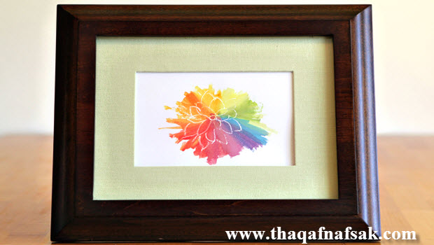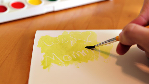 عند الأنتهاء من الكتابة او الرسم قومي بإختيار الألوان التي ترغب في تلوينها على البطاقة وضعيها ثم إبدأ بتلوين اللوحة بالفرشاه وتمرير الألوان فوق الكتابة .