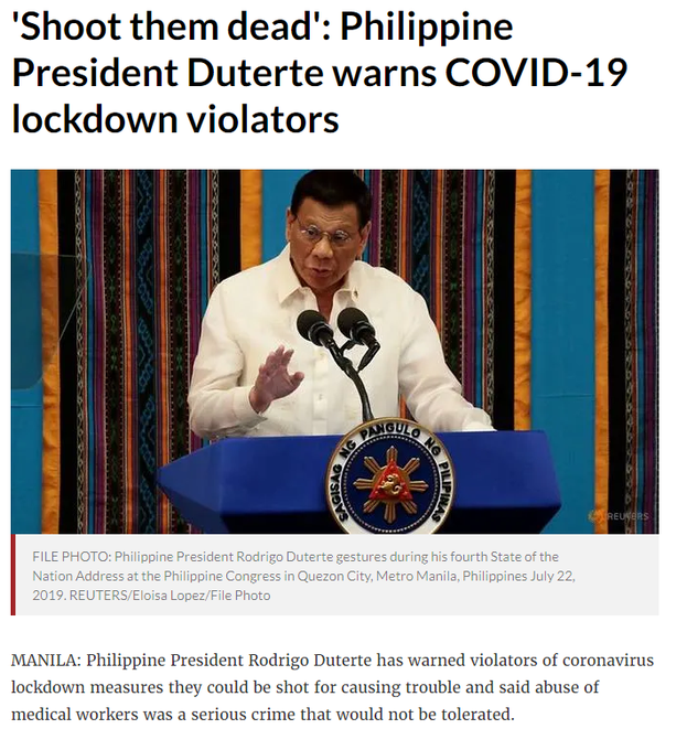 الرئيس الفلبيني (رودريجو دوتيرتي) حذر مخالفي حظر التجول حيث قال :